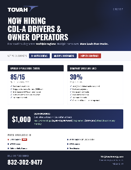 OWNER OPERATORS – FRAC SAND Well-established frac sand carrier with active wells in South TX, West TX & Louisiana. • Power only• No waiting on loads• 24/7 reliable dispatch• Fuel card provided• Mechanic support avail...